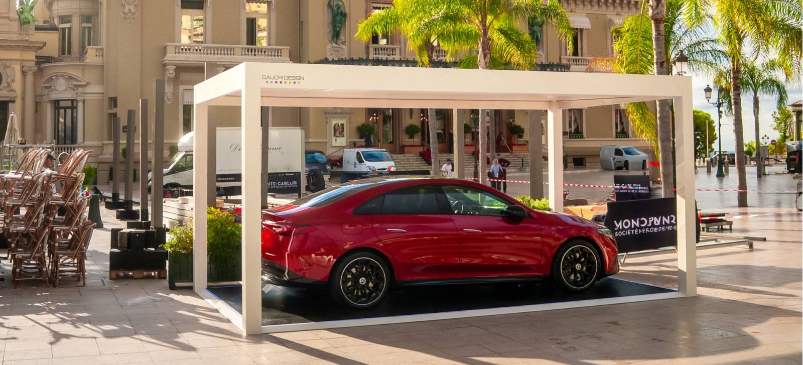 Sous cette réalisation, c’est une voiture d’exception qui attire tous les regards : une Mercedes CLA, mise en jeu par le Casino de Monte-Carlo. L’association de ce véhicule de prestige et de notre carport renforce l’image d’exclusivité et d’innovation qui caractérise cette installation.