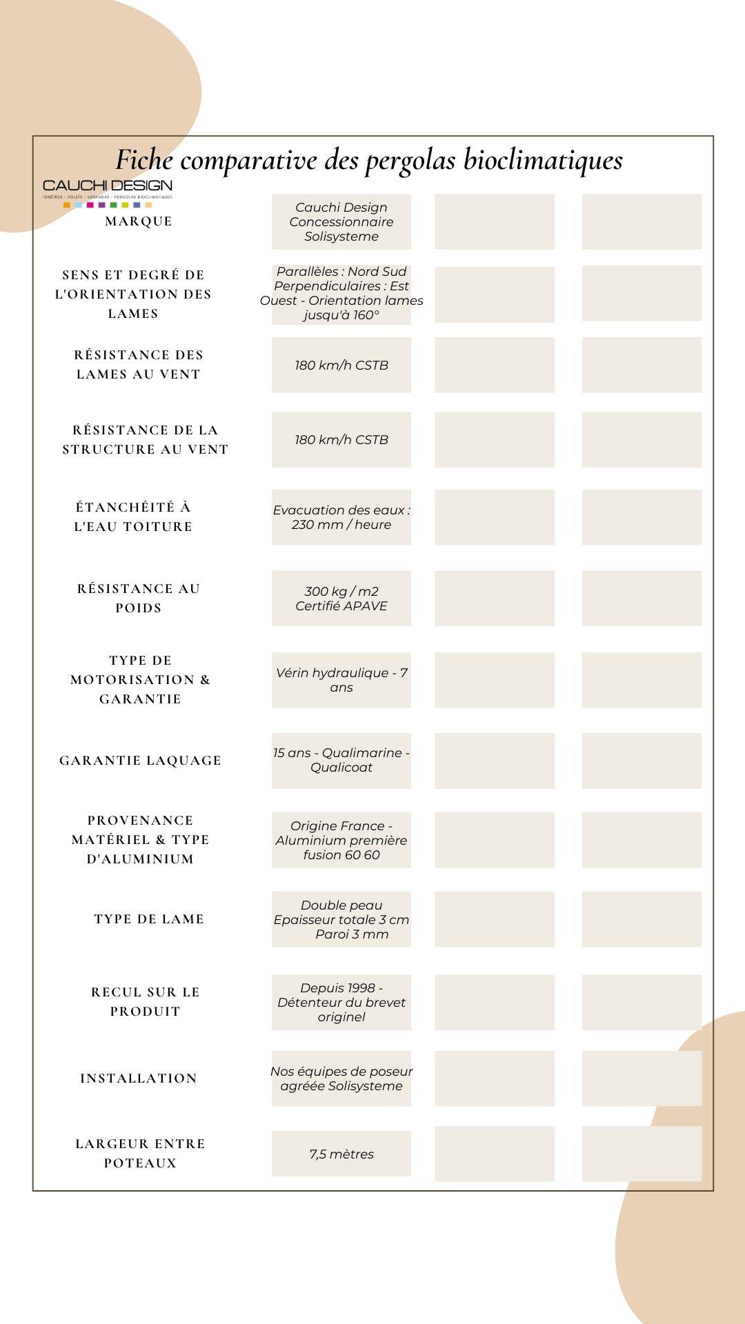 Nous savons que la décision d’installer une pergola bioclimatique est une décision importante. De ce fait, il est donc tout à fait normal que vous souhaitiez comparer les produits, les devis et les tarifs en fonction des caractéristiques de nos pergolas bioclimatiques par rapport à celles de nos confrères.