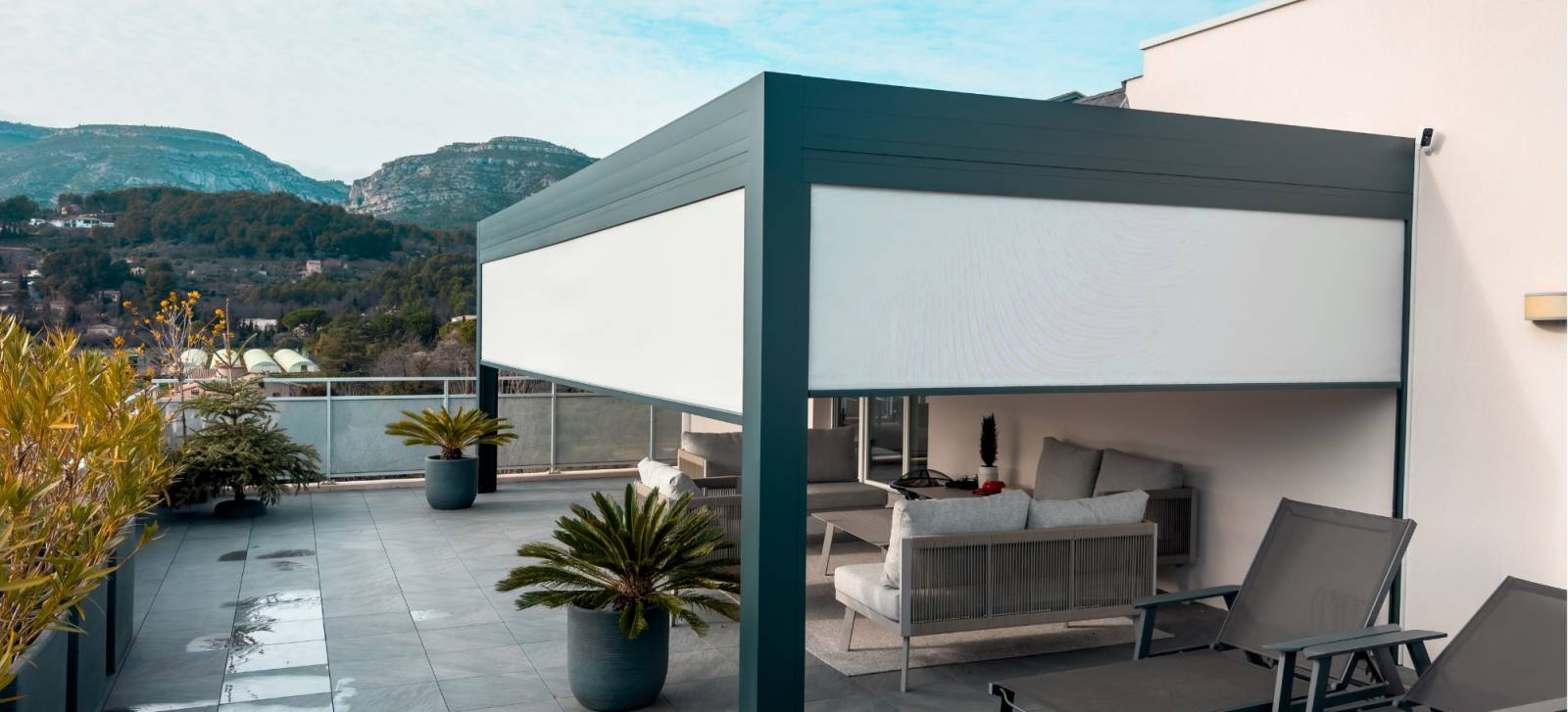 Sur une pergola, les stores ZIP agissent comme de véritables parois modulables. La couleur de la toile influence :