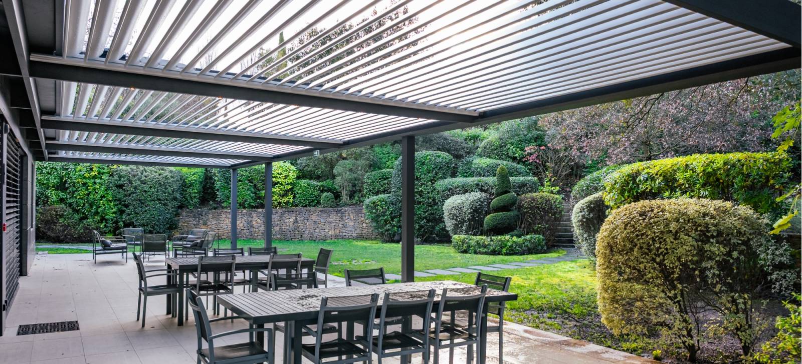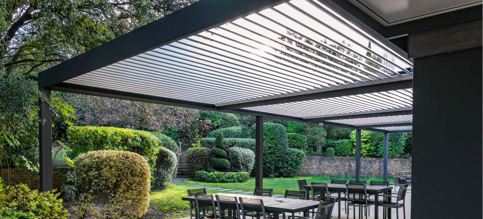 Une pergola bioclimatique bien installée transforme véritablement l’usage de la terrasse. En été, les lames orientables protègent efficacement du soleil tout en laissant circuler l’air. En hiver ou par temps de pluie, la fermeture des lames assure une bonne protection.