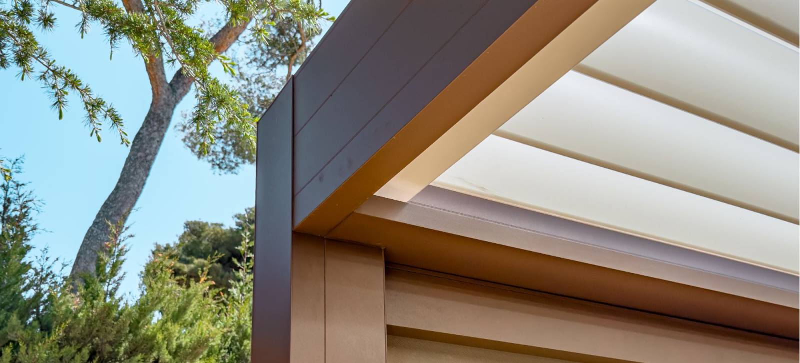 La pergola est équipée de lames orientables motorisées, permettant une régulation précise de l’ensoleillement et de la ventilation naturelle. Fermées, les lames assurent une parfaite étanchéité en cas de pluie. Ouvertes, elles favorisent la circulation de l’air et la fraîcheur en été. Le coloris brun RAL 8028 donne une touche raffinée à la structure, en parfaite harmonie avec les teintes naturelles du jardin ou de la terrasse.