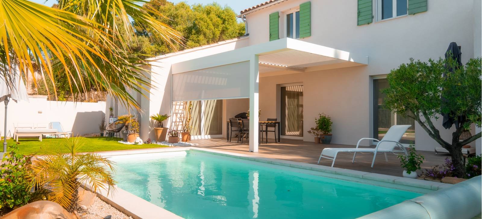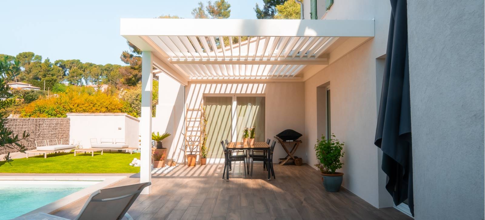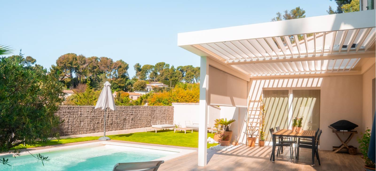 Le choix du coloris RAL 9010 (blanc pur) apporte une touche moderne et lumineuse à l’ensemble. Cette teinte intemporelle s’accorde facilement avec tous les styles de façades, qu’elles soient contemporaines ou plus traditionnelles. Elle reflète également la lumière naturelle, renforçant la sensation d’espace et de clarté sous la pergola. Ce type de finition est particulièrement apprécié dans les régions ensoleillées comme celle de Ceyreste.