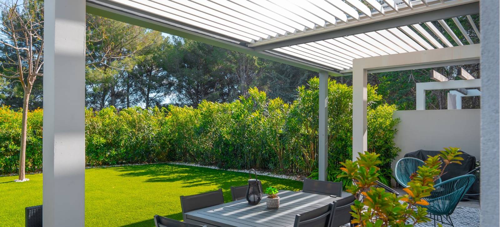 L’installation a été pensée pour répondre aux exigences du climat méditerranéen, avec des lames orientables permettant de réguler la température en été comme en hiver. Le choix du format 7 x 3 m offre une belle surface de vie extérieure, idéale pour profiter des repas en famille ou entre amis, à l’abri du soleil ou de la pluie.