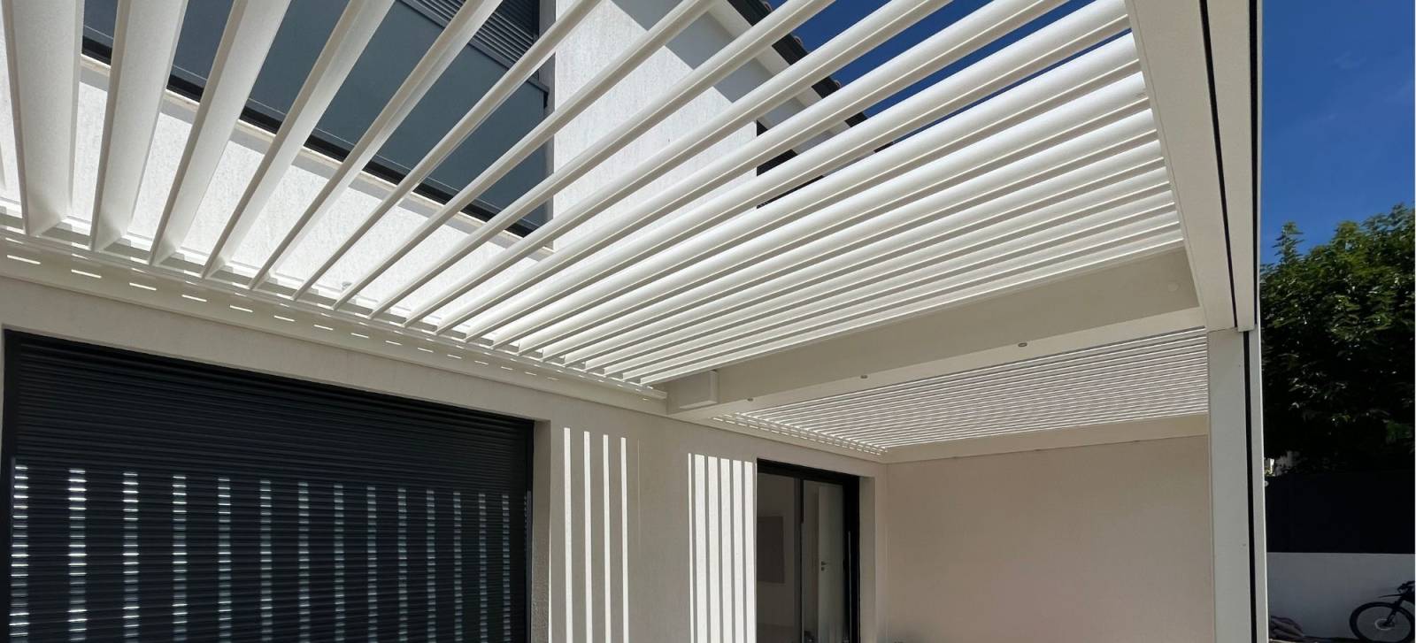 La pergola est équipée de lames orientables, permettant de moduler l'ensoleillement en fonction de l'heure, de la journée et des saisons. Lorsqu'elles sont ouvertes, elles permettent de profiter d'une lumière naturelle tout en laissant passer une légère brise. Fermées, elles bloquent efficacement les rayons du soleil, offrant ainsi une ombre agréable sur la terrasse tout en faisant intervenir la chaleur à l'intérieur de la maison.