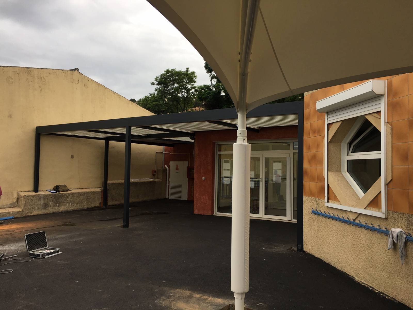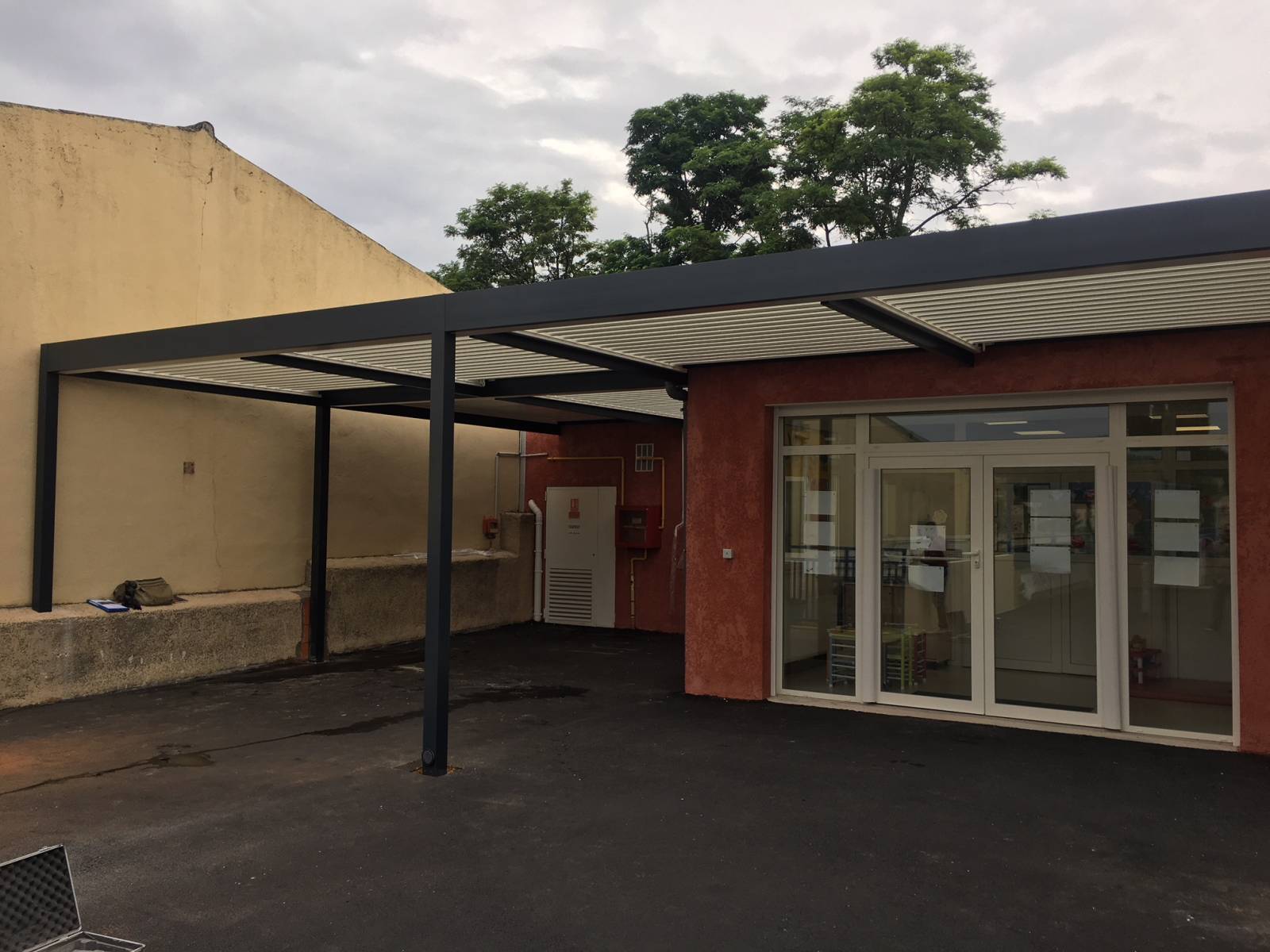Nous vous laissons découvrir, grâce aux photos, la fourniture et l'installation d'une pergola bioclimatique à lames orientables bicolore en aluminium à l'entrée d'une crèche dans les Bouches-du-Rhône et plus précisément à Marseille.