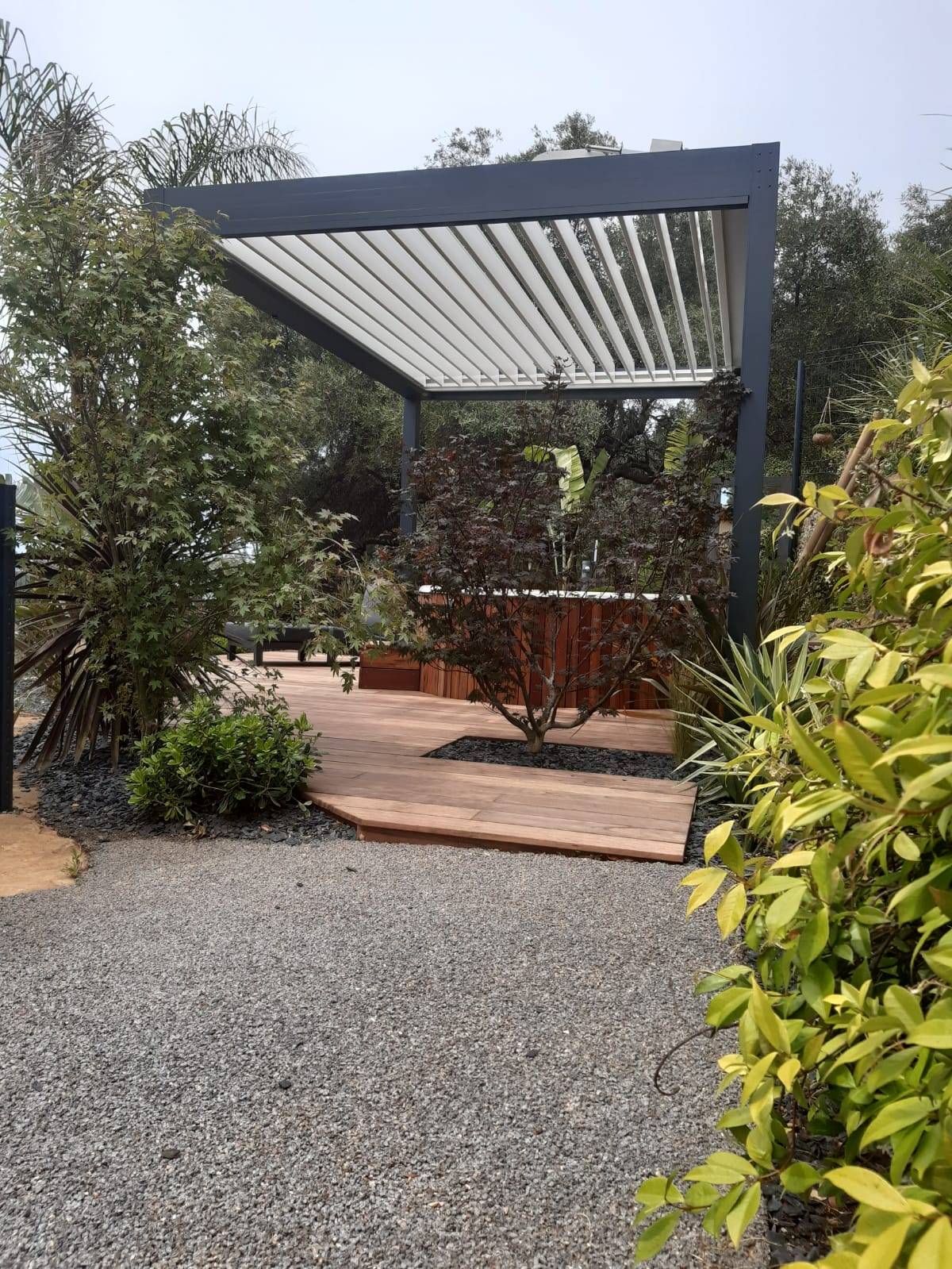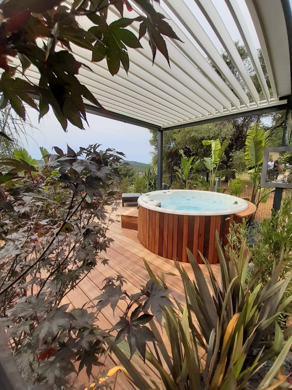 Notre client à choisi d'installer un jacuzzi sous la pergola , ce qui lui a permis de créer un espace de vie extérieur et du coup d'harmoniser son jardin !