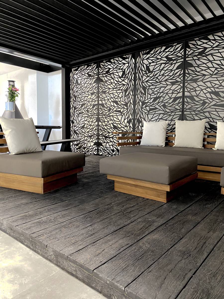 Cauchi Design vous propose de découvrir une de ses dernières nouveautés du showroom, une pergola bioclimatique équipée d’une fermeture qui est un claustra décoratif avec une découpe au laser !