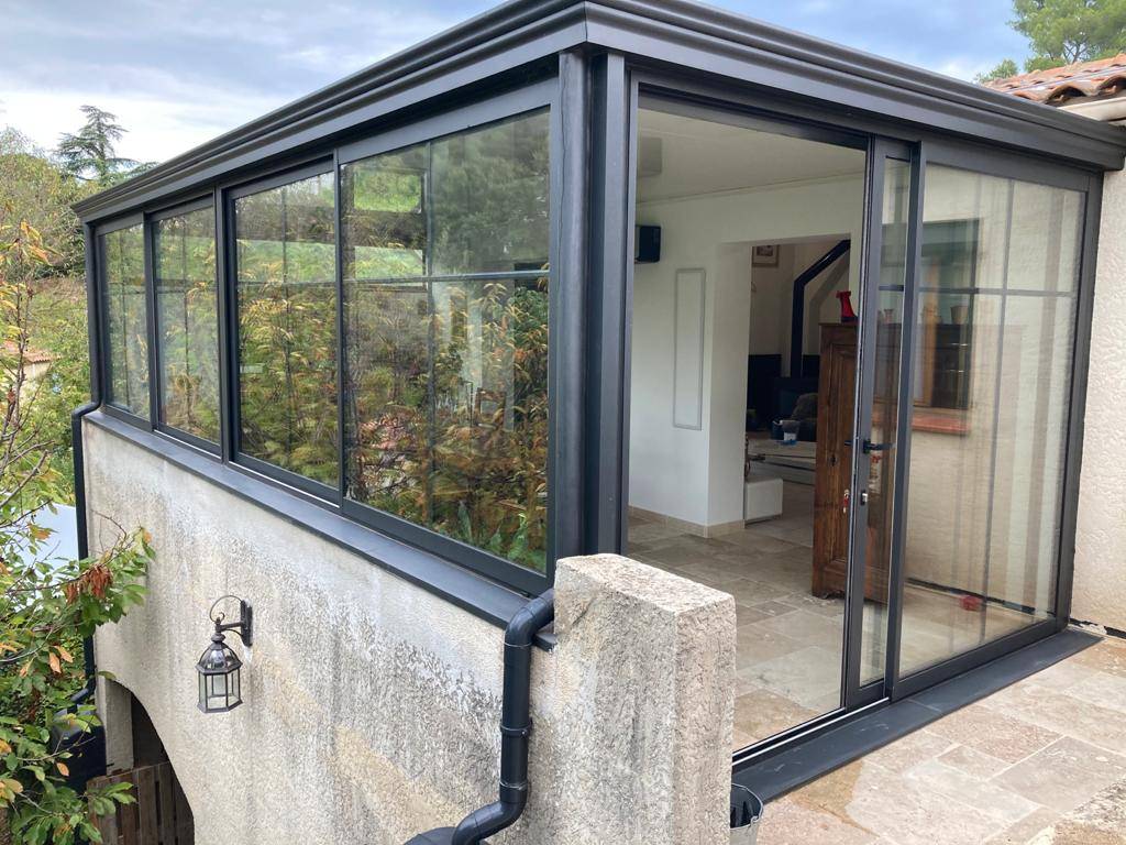 Afin de conserver l'esprit de la maison, nous avons ajouté à cette réalisation de véranda à Marseille des traverses et des montants intermédiaires aux menuiseries installées.