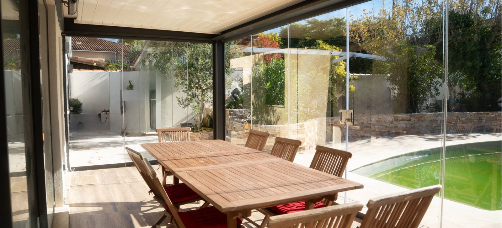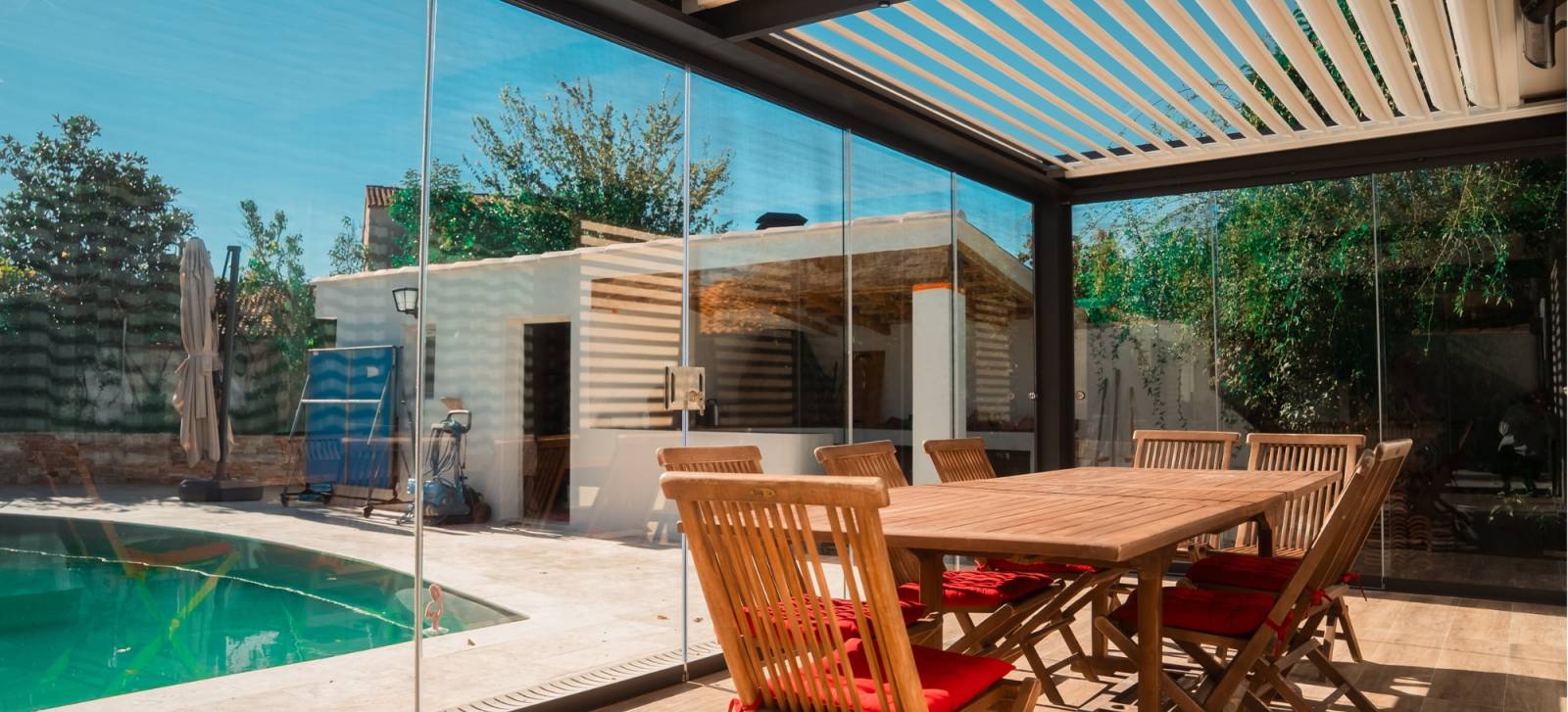 Les rideaux de verre créent une barrière efficace contre le vent, la pluie et les basses températures, tout en conservant la chaleur intérieure. Associés à un système de chauffage intégré, ils garantissent une température agréable même en hiver. Le client peut ainsi dîner, lire ou recevoir des amis sous sa pergola sans craindre le froid, tout en profitant de la vue sur le jardin.