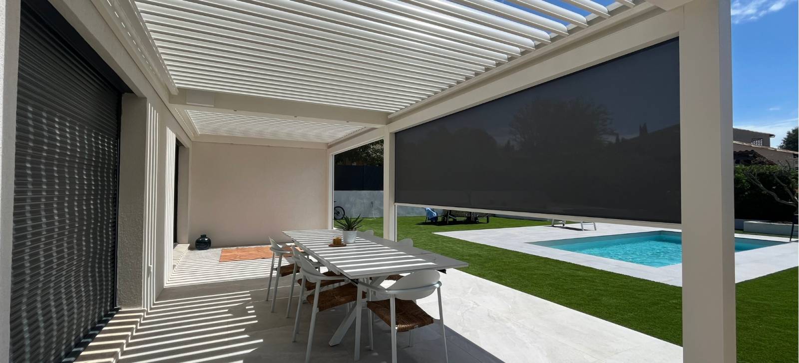 Une pergola RAL 9010 équipée d’un store zip ROMA en Serge 5% gris anthracite, installé devant la baie vitrée du salon : une optimisation parfaite du confort à Allauch.