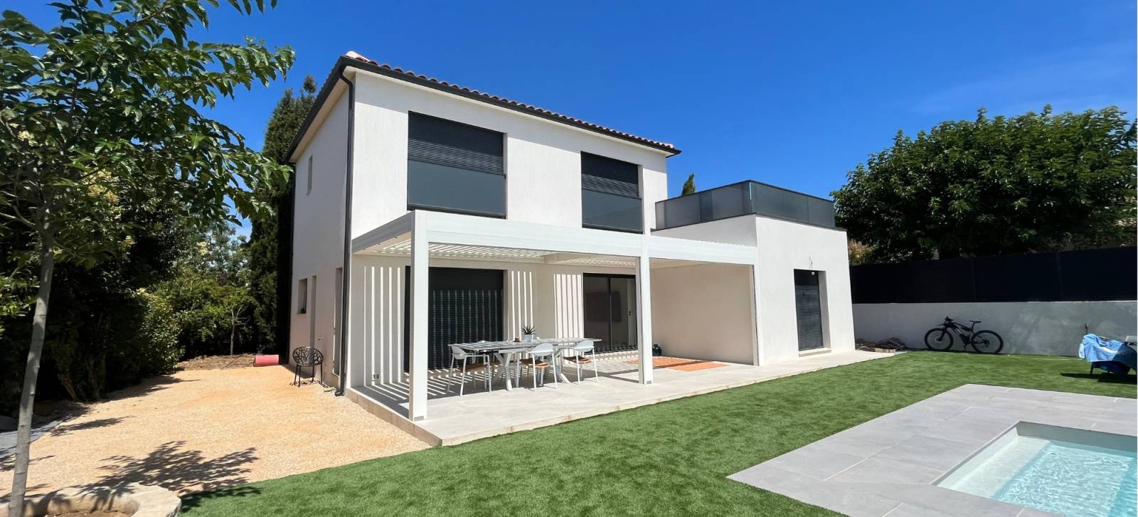 Cette installation à Allauch illustre parfaitement l’alliance du design, de la technicité et de l’usage intelligent de la pergola bioclimatique. Grâce au store positionné idéalement devant la baie vitrée, la maison bénéficie d’un confort intérieur préservé tout en profitant d’un espace extérieur esthétique et durable.
