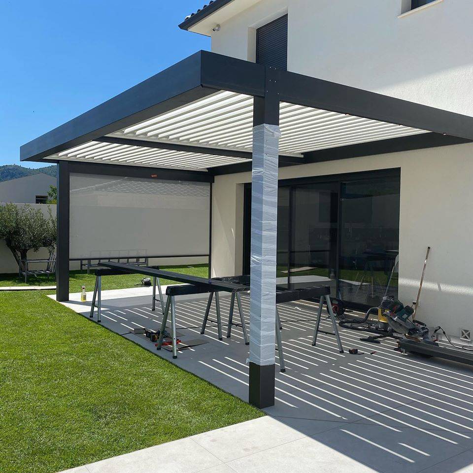 En plus d'avoir fourni la pergola qui permettra au client de profiter de sa terrasse été comme hiver grâce aux lames orientables qui permettent d'aérer naturellement la terrasse lors de fortes chaleurs ou bien de faire rentrer les rayons du soleil à l'intérieur de la maison l'hiver, nous avons également installé un store enrouleur sur le côté de la pergola !