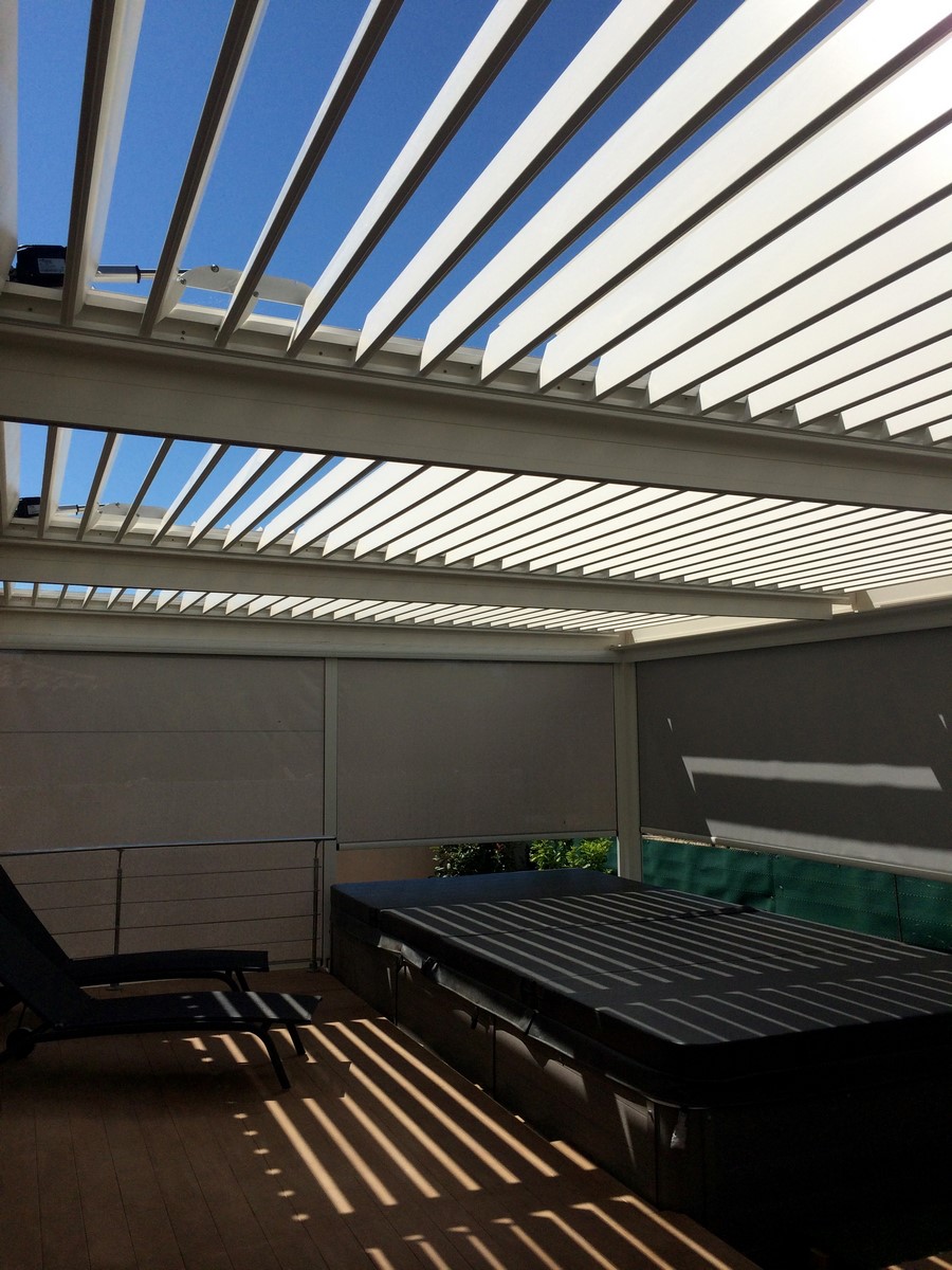 Les stores enrouleurs sont une réelle solution de fermeture latérale pour les pergolas bioclimatiques.